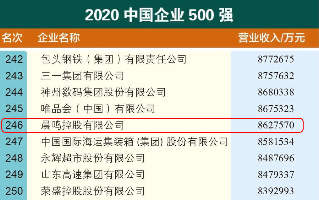 9月27-28日,由中國企業聯合會、中國企業家協會主辦的第19屆“2020中國500強企業高峰論壇”在河南鄭州召開,備受矚目的“2020中國企業500強”榜單正式發布,晨鳴控股排名第246位,位居行業榜首。在同期發布的“2020中國制造業企業500強”榜單中,晨鳴控股位列107位。