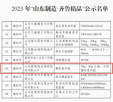 2023年“山東制造·齊魯精品”評選活動由省工業和信息化廳聯合山東廣播電視臺、省質量管理協會組織開展,經企業自愿申報、有關部門推薦、專家論證等程序評選,確定了包括山東晨鳴紙業集團股份有限公司“70g、80g云鏡、云豹靜電復印紙”在內的全省123項產品為2023年“山東制造·齊魯精品”。