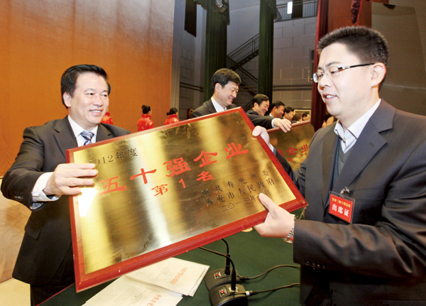 2月26日,全市三級干部會議在濰坊科技學院國際會議中心隆重召開。會議表彰獎勵了2012年度先進單位、先進集體和先進個人,我公司位列全市五十強第一名。圖為市委書記孫明亮為我公司頒發獎牌。